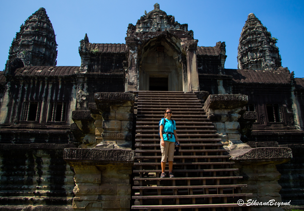 Elisabeth is excited for this. She is a structural engineer, and was looking forward to seeing this for a long long time. Here she makes the first of many climbs up steep staircases to explore the inner complexities of Angkor Wat.