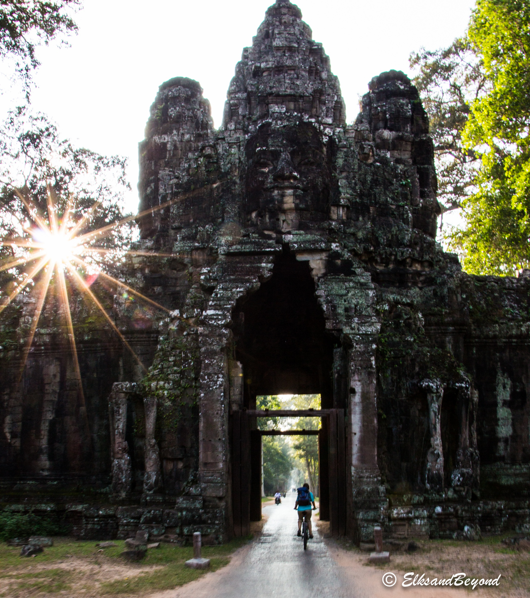 Nearing the end of our day still pedaling along we pass through the Victory Gate of Angkhor Thom, the last Capital of the Angkorian Empire. Angkhor Thom houses the temple of Bayon and Baphuon built in the late 12th century.