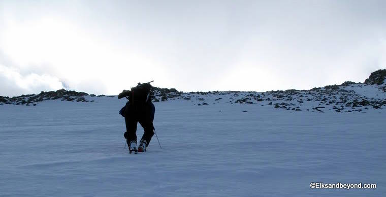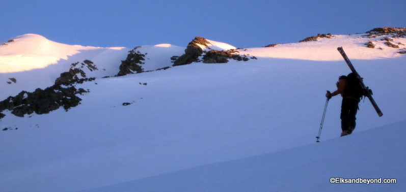 We opted for Ellingwood first as it recieves the earlier sun hit. We skinned straight across the lake and on up above treeline. We continued skinning in the dark up to the upper basin between Blanca and Ellingwood. At this point we ditched our skins and at the same time began to see the first light on Ellingwood.