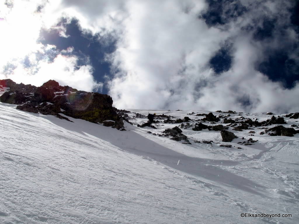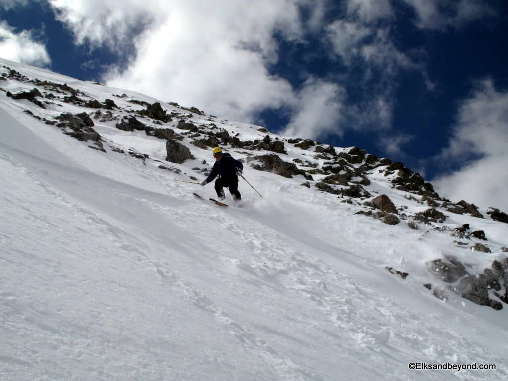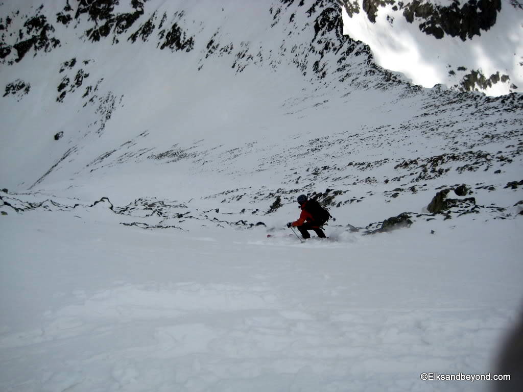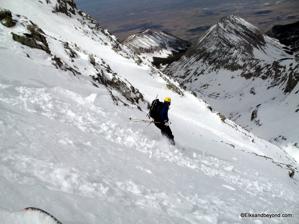 The snow on Ellingwood was noisy to say the least. It was still frozen from the night before, but made for safe skiing. The snow down Blanca was extremely hard skiing with breakable crust most places with a very soft layer underneath that offered little support. As i did a jump turn in one spot the snow below me all gave way and i started to slide over a couple rockbands. We decided it was worth a picture once we got down.