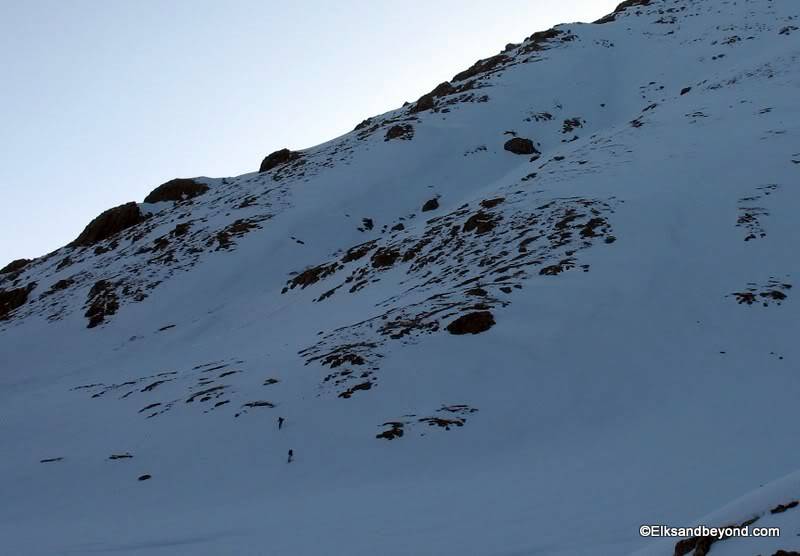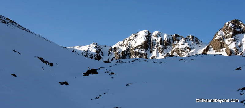 After an afternoon of sitting around (I was sick for most of it) we went to bed early and the following morning the alarm came at 4 am again. Two of Frank and Brittany’s friends had showed up the day before and headed up with us to the American Basin TH while we left one car down at the TH. We were a little slower getting ready today but we were on the snow skinning by 5:55 am.
