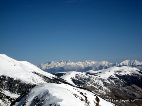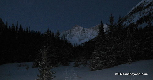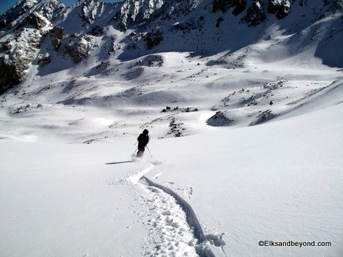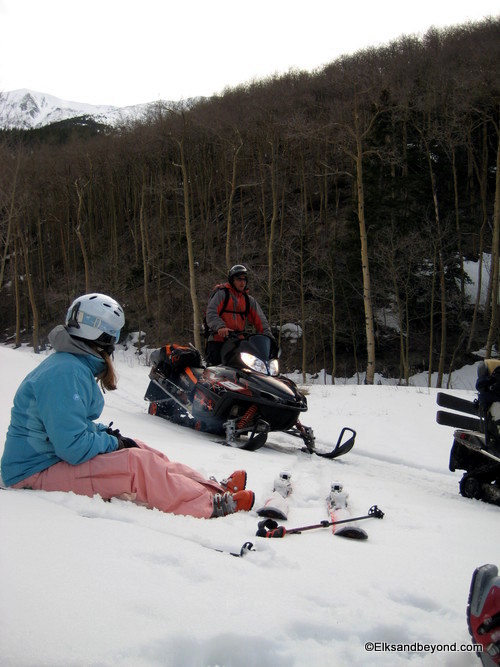 Well after driving down to meet Frank Konsella and friends at the TH for Lindsey on Saturday night, we awoke at 3 am on Sunday morning to clear skies and reasonable temperatures. We drove the 3 miles to the TH from our campsite and loaded up on the snowmobiles Jeremy had brought from Crested Butte. We cruised up the 4 miles to the summer TH and after a few stops we were there. We started skinning down the trail around 5:20 am.