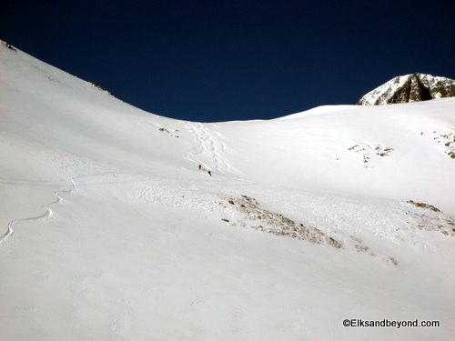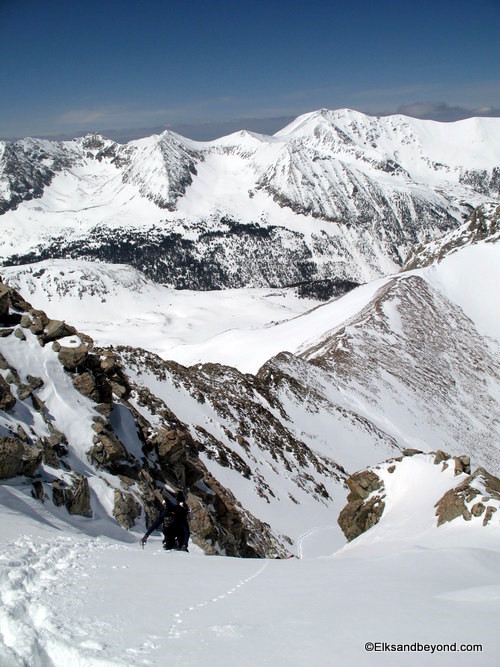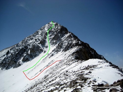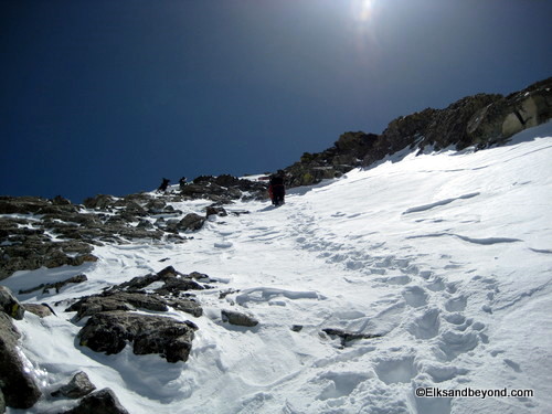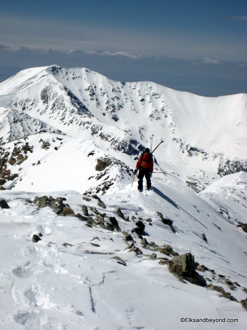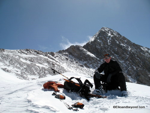 From here we started up the ridge connecting us to Lindsey and made fairly quick time of the easy boot pack to 13,100 ft on the saddle between Lindsey and the nipple.