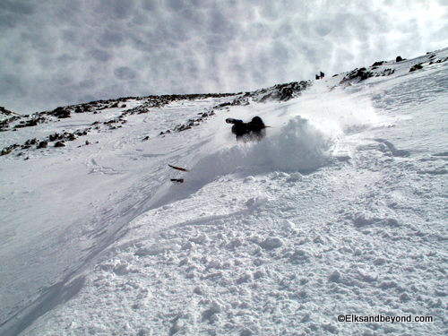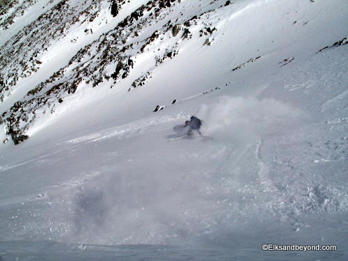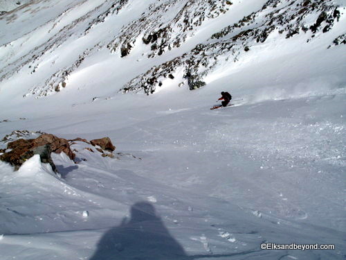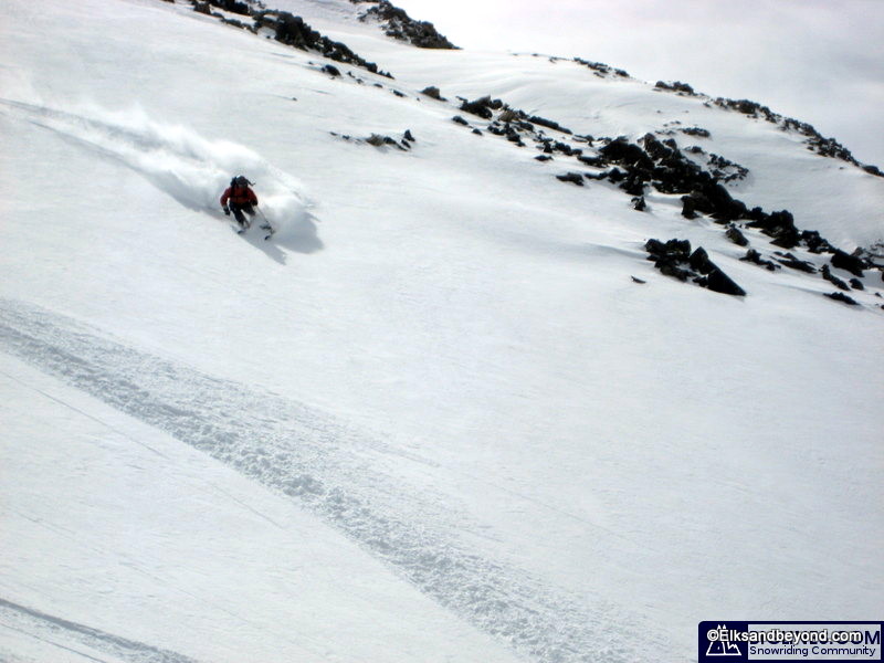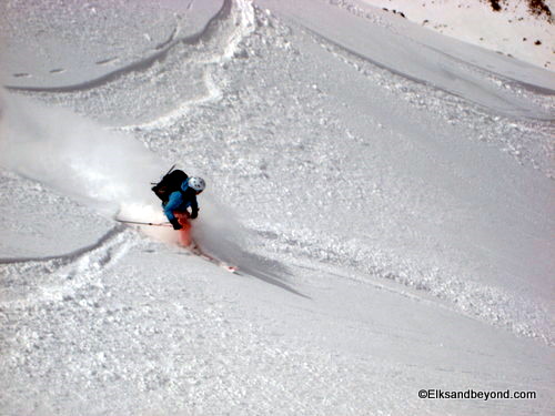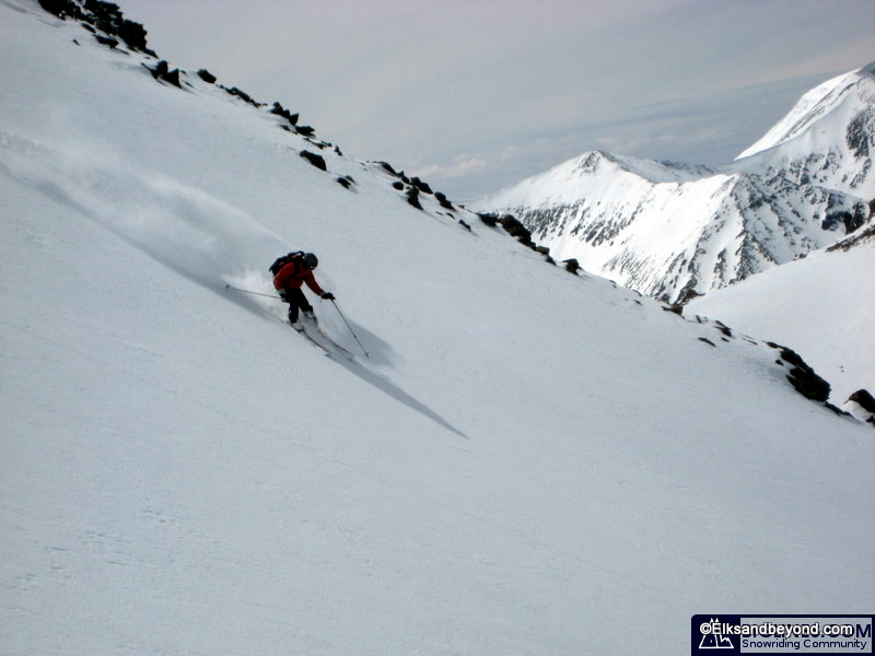How about the ski descent now, we dropped in on about 100 feet of windhammered snow, and then enjoyed 1800 feet of powder skiing to the valley below. Frank dropped in to take a few pictures and then Jeremy ripped the line top to bottom so he could film from the bottom. I followed and stopped about 3/4 of the way down to take pics (and my legs were on fire!) Kelly came cruising by, followed by Frank and Brittany.