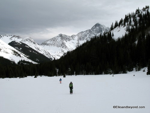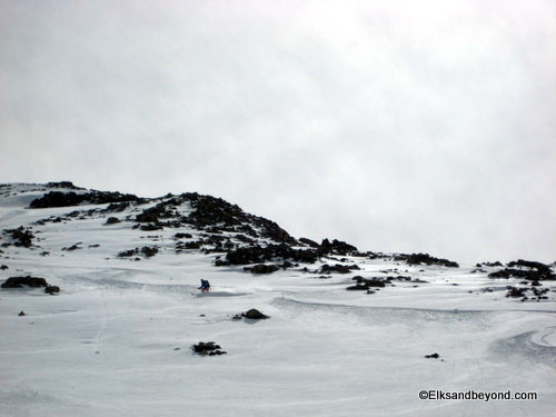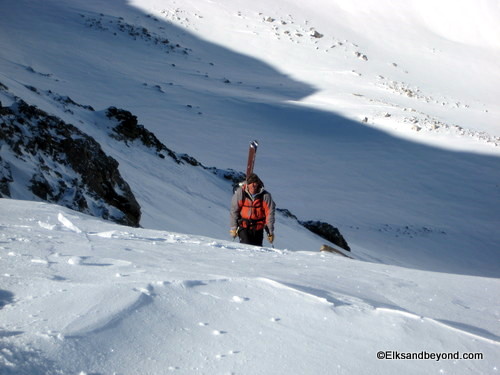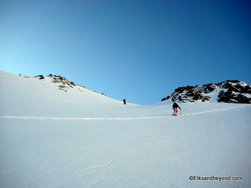 Well after skinning up valley a ways we came to a decision point, we had to decide which one was the Iron Nipple and which valley we wanted to ski up. Well in the end we chose the one on the right which was our screw up for the day. We ended up climbing a ridge that was separated from the one we wanted by a large basin below us. But oh well, we got about 500 feet of powder skiing in (and that much more climbing).