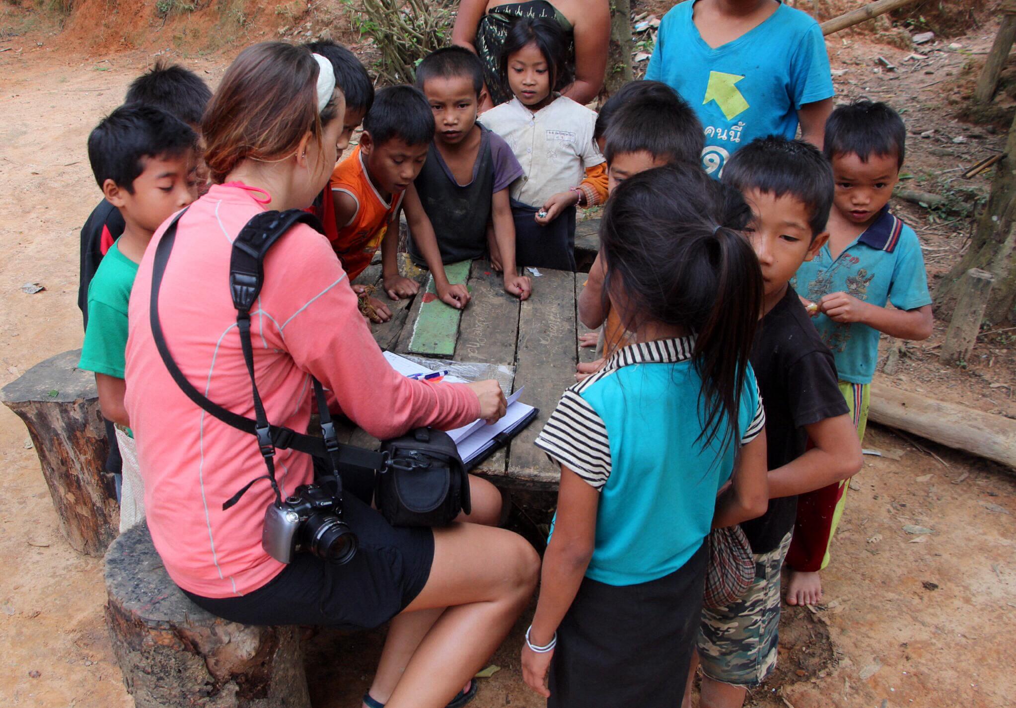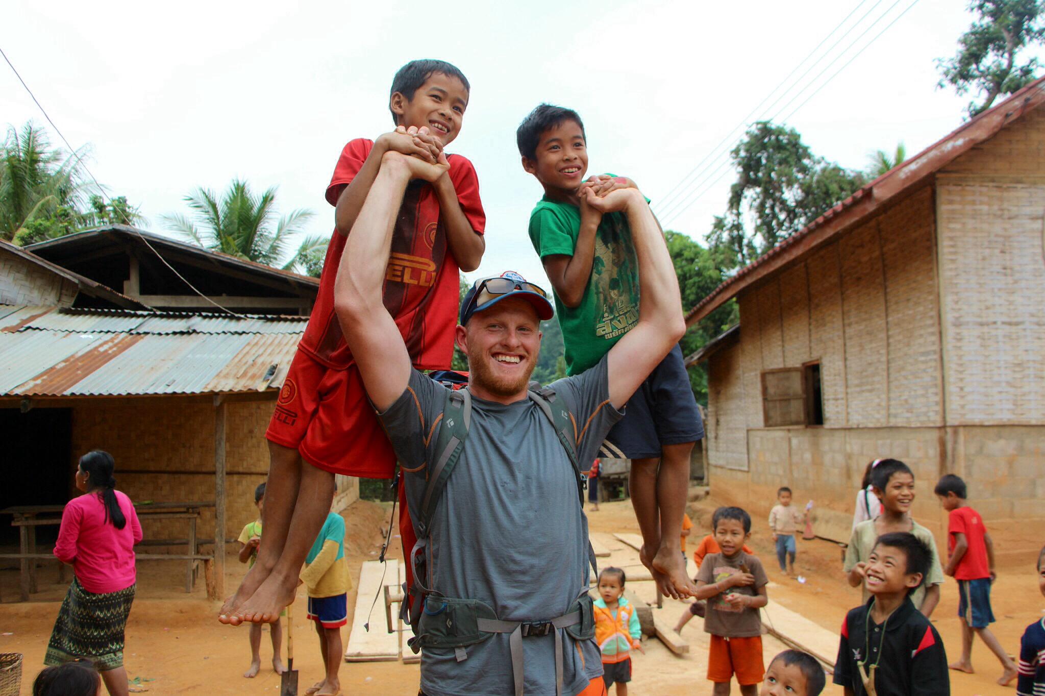 Bia took us to meet his grandma or great grandma in this small, single room home with some blankets on the floor. We decided to buy some more candy and next thing we knew, we were surrounded by many of the of the village’s children. Jordan noticed that Da’s shoes had holes all the way through the soles, so Jordan told him and Bia to come into town with us, and they brought their friend Bon with and when we got to town we went to a little shop on the other side of the bridge. We had Da pick out a brand new pair of shoes which cost $1.25, so we had Bia and Bon pick out shoes too. Then Jordan had Bia and Da pick out a large rain jacket and a headlamp for each of them, since they were cave tour guides, they needed flashlights. Seeing their faces light up was amazing, but seeing they joy Jordan had doing this for them was priceless.
