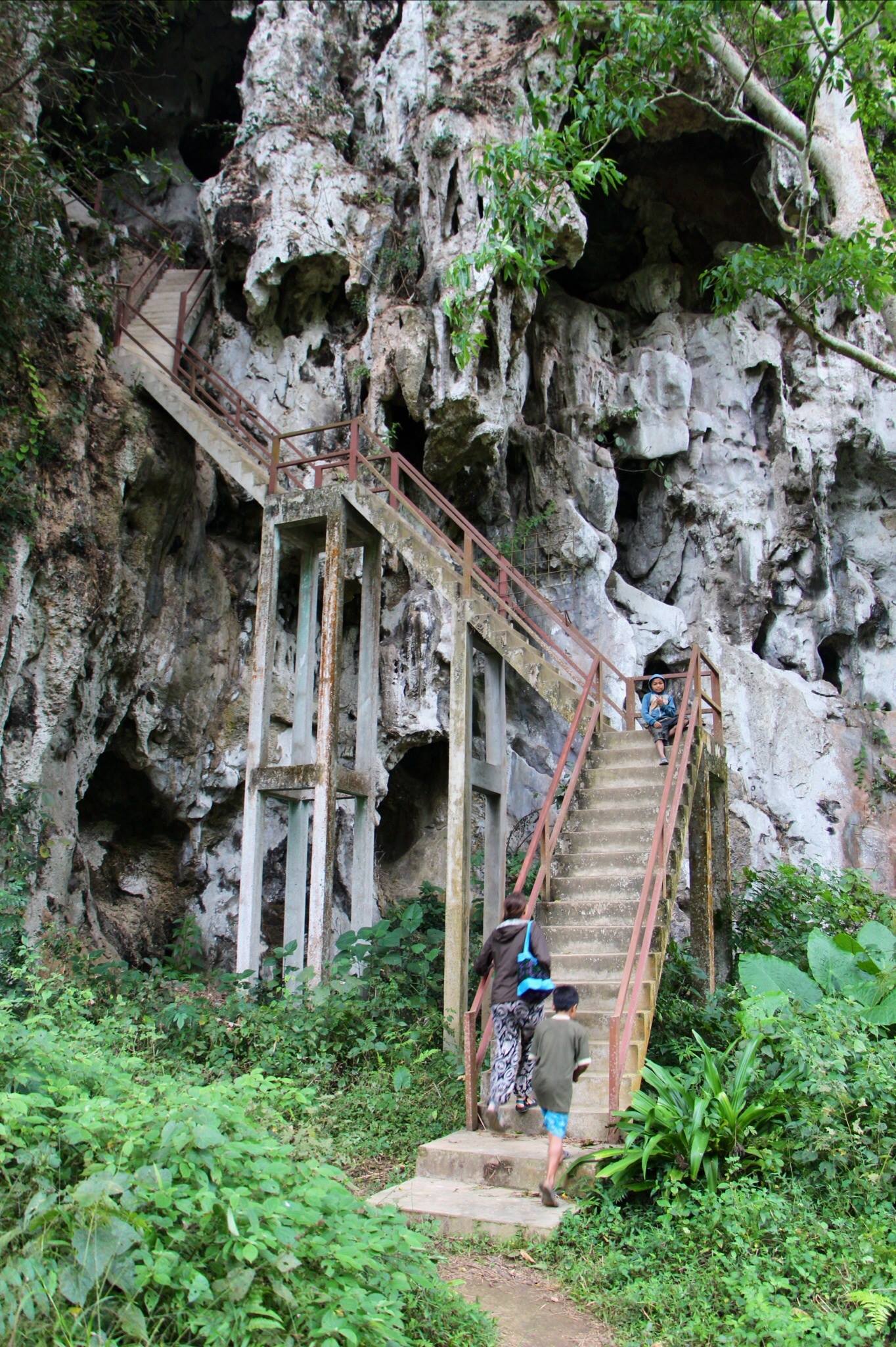 After traveling downriver a bit we saw a large bridge spanning the river and we had arrived at our destination of Nong Khiaw. We headed straight to the Meexai Bungalows which had large rooms, but the beds were not much softer than the tile floor. We decided to rent bikes and head to the caves at Tham Pha Thok. When we arrived we were greeted by two young boys named Bia and Da, who immediately became our tour guides for the afternoon. The first cave we visited was massive, and it was where the government officials lived to protect themselves during the bombings in the second Indochina War.