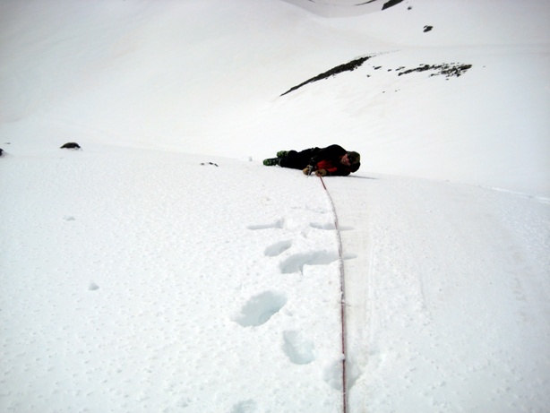 Next, Tyler put his skis and skins on and Colby got to be the victim. Arresting a fall with skis on your feet, especially in tour mode with skins is hard, it’s just plain hard. As soon as Colby was moving down hill Tyler fell on his whippet arrested the fall. While the snow yesterday was not great for sliding, Tyler still noted how tough it is to get your skis in a good position under you to get edge hold. I set an anchor below Tyler using a Picket and a prussik, and we repeated the proccess.