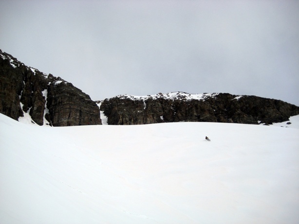 I was becoming more and more concerned with the snow and how it would react on a steeper slope. While I know it is June, and usually by this time of year stuff is pretty consolidated, there was one inch of crust on top of about 2 feet of slush, with a dirt layer about halfway down. We opted to start booting up a couloir and it only took us about 100 vertical and we’d had enough. It didn’t feel safe, it wasn’t fun, and it the skiing wasn’t going to be worth the risk to get there. We skied down on some funky punchy snow that had even the best skiers in our group dancing a little bit.